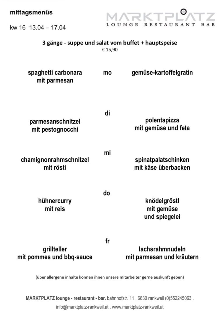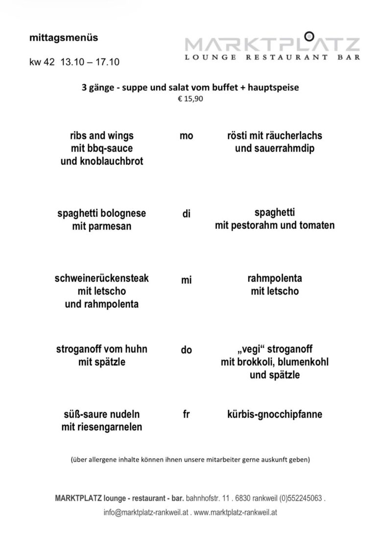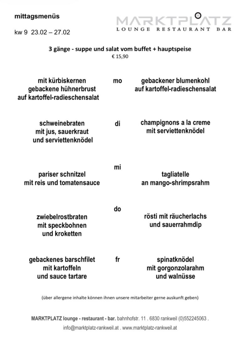 wochentags (mo-fr außer feiertage)wir servieren unsere mittagsmenüs von 11:30 - 13:45 uhr(solange der vorrat reicht)suppe und salat entnehmen sie von unserem reichhaltigen buffet.